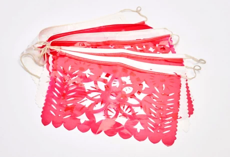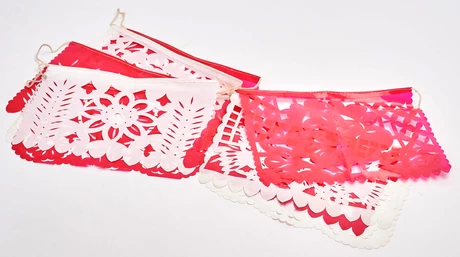 "Papel picado" les llaman en México a estas tiras de coloridos banderines, hechos en plástico calado como encaje, con distintas figuras, ideales para decorar las calles, terrazas y casas. Tradicional decoración de la fiesta del 1ro de Noviembre o "Día de los muertos", estos banderines en realidad son parte de las calles y casas mexicanas todo el año.