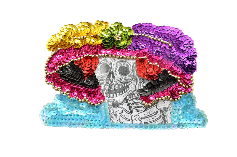 Bordada a mano con coloridas lentejuelas + una impresión en blanco y negro a la usanza de los grabados populares, esta alegre aplicación es ideal para enmarcarla o coserla a tus prendas de vestir para dar un toque original a tu día a día.
