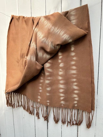 Práctico individual o paño tea towel, realizado en crea de algodón crudo y teñido con la técnica de amarras o shibori con varias capas: cáscaras y cuescos de palta + semillas de achiote, todo100% natural.